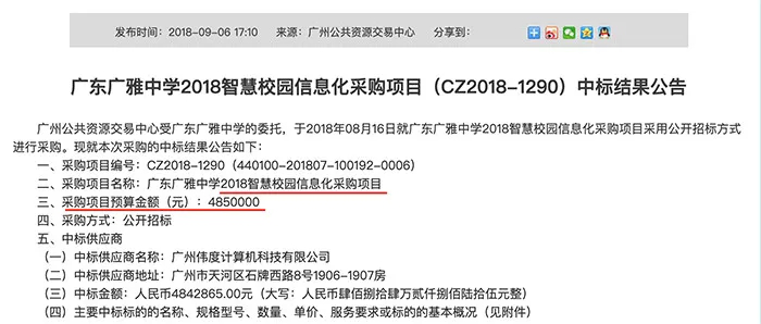 3月4日晚间,网友@“csstststst_”发布微博,微博附图显示,2018年9月6日,广东广雅中学在广州公共资源交易中心上发布采购项目中标结果公告。