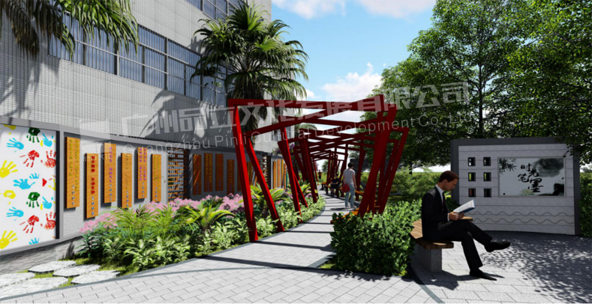 穿过时光隧道,时光廊架的终点是花丛簇拥的学校简史,由建筑立面自然形成的“文化墙”可做学校简史设计,契合时光的理念,通过错落有致的木板记载,向人们展示纪中精神内核。也使校友们回校回收记忆更多感悟。
