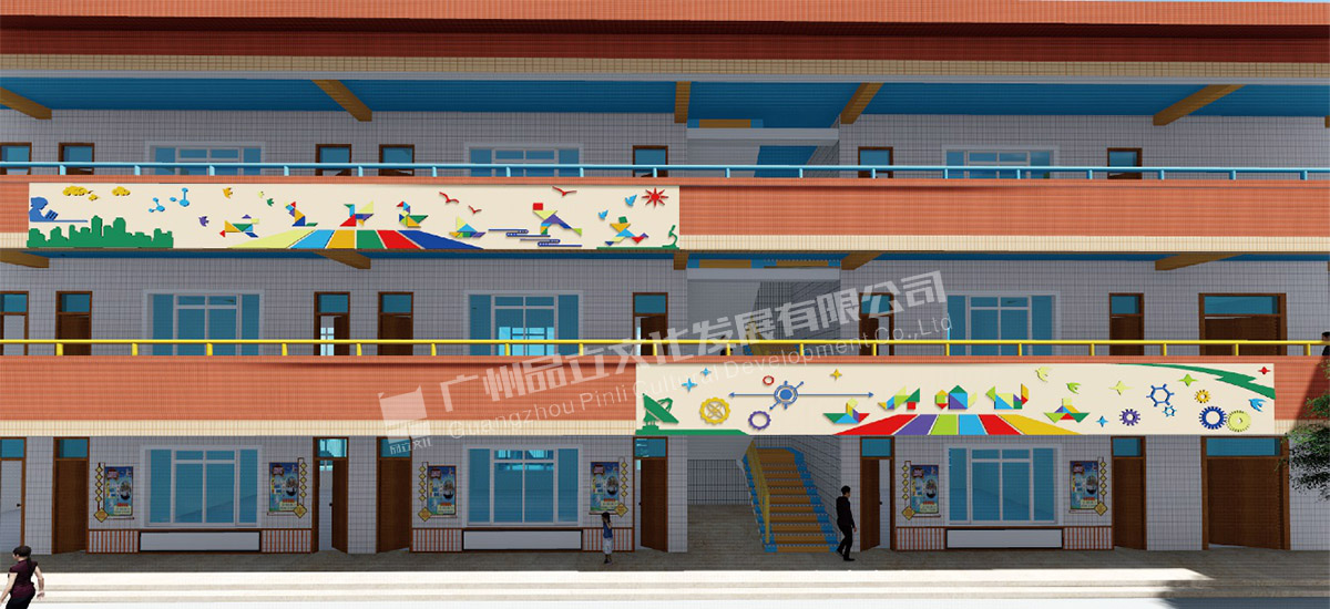利用“七巧板”元素,将学校学生设计作品及运动形态、棋艺三者融入其中,使整个文化墙变现校园文化,和谐统一。